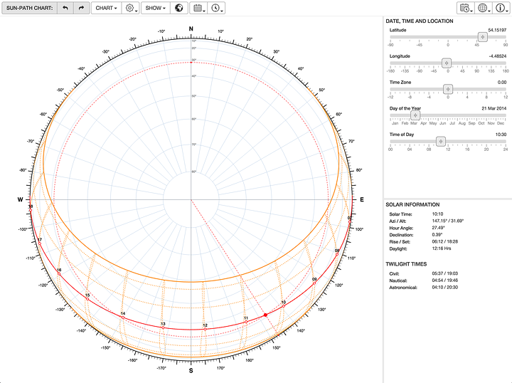 Shows how solar position changes by location and season, with interactive Sun-path diagrams and shadows.