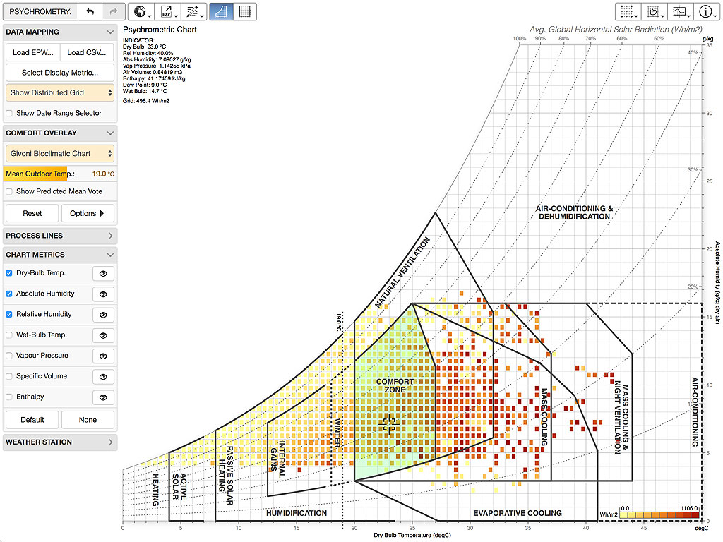 Displays psychrometric data with comfort metrics, weather file support, and ASHRAE/EN comfort diagrams.