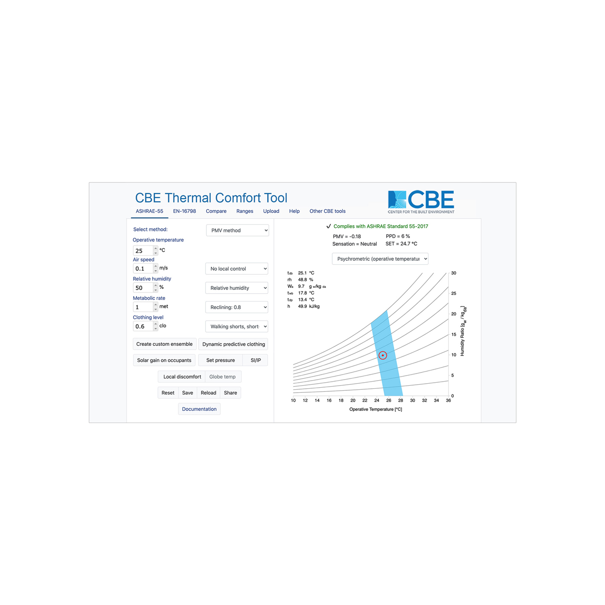 Predicts thermal comfort per ASHRAE 55, with psychrometric/temperature-humidity charts, LEED documentation, and PMV/adaptive models.