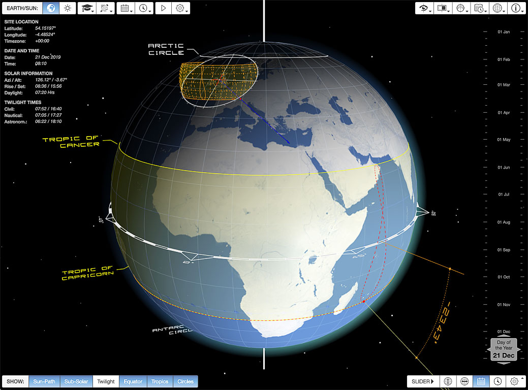 Models the Earth–Sun orbit to show solar motion, with controls for geo/helio views, dates, times, and overlays.